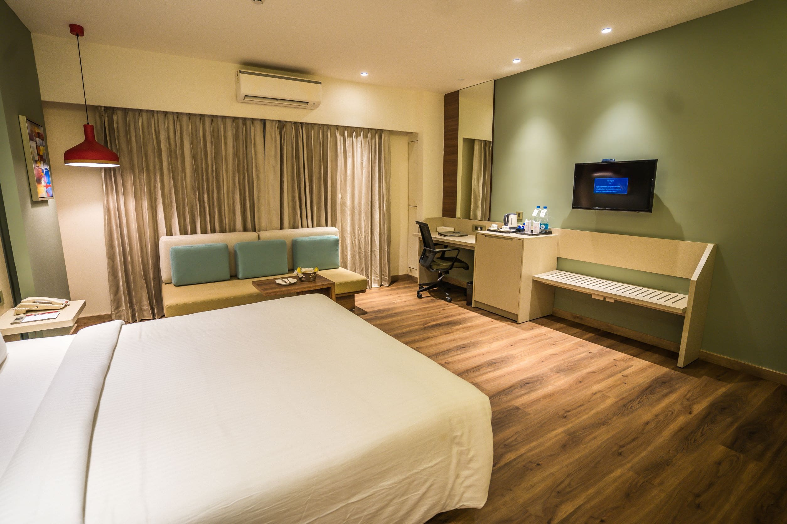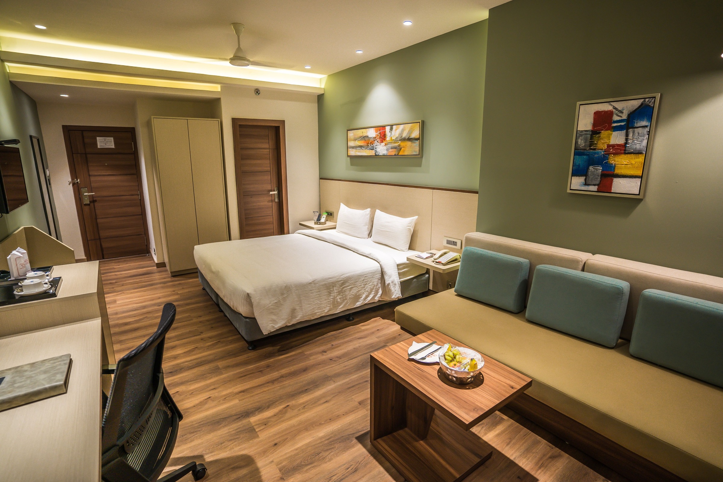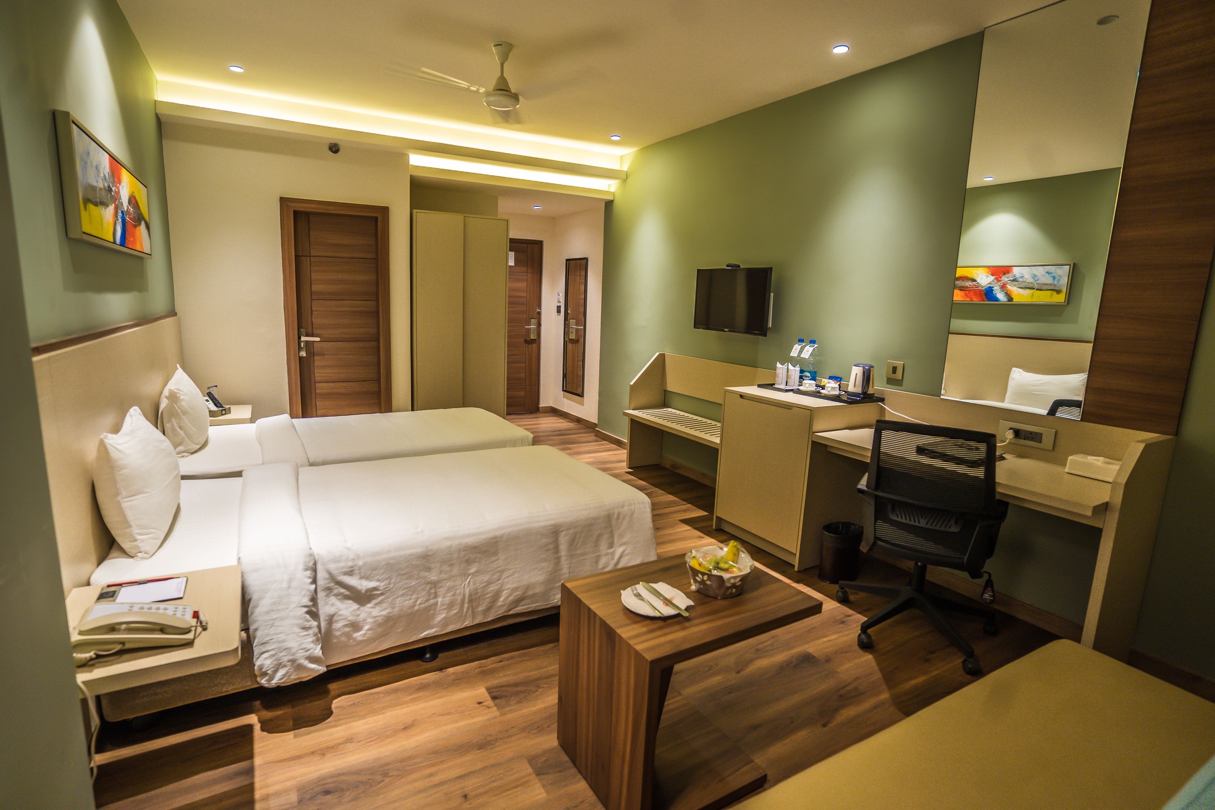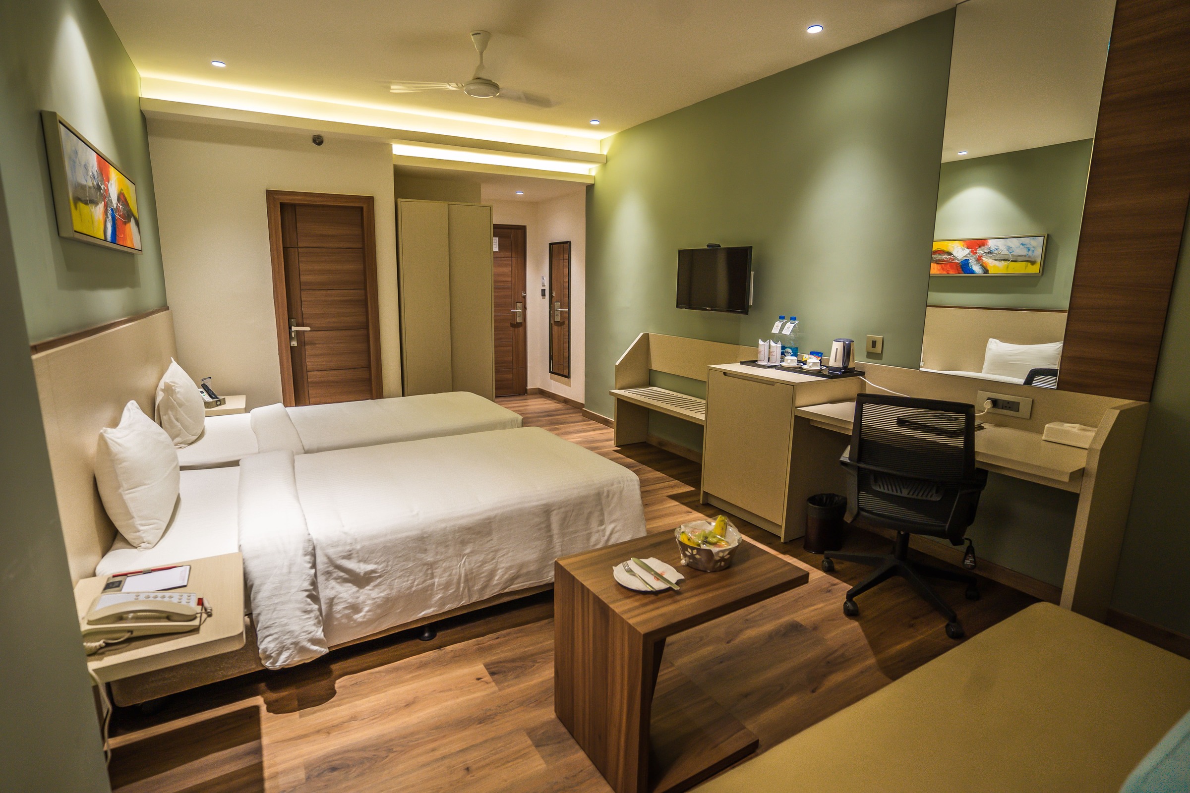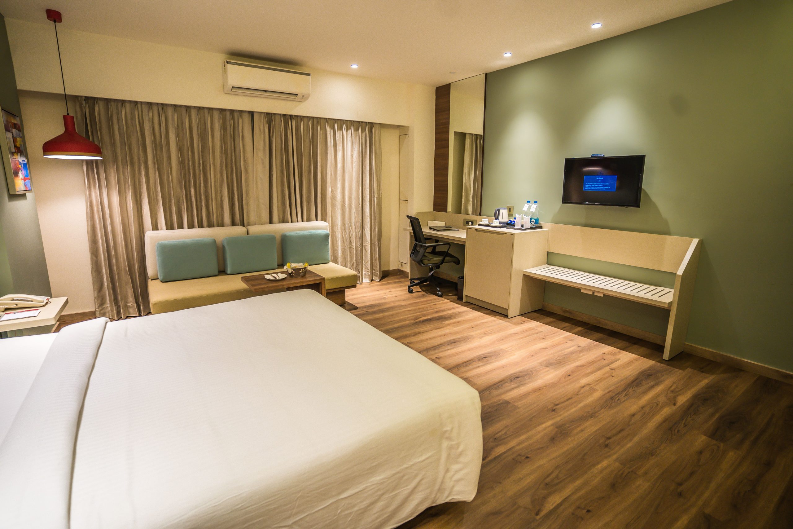 The state of the art and modern deluxe room comes with super- King sized bed or a Twin Bed for Business Travellers, LED TV with 100+ satellite channels, Mini Fridge, soundproofing and air conditioning systems. The bathroom has a Power shower, mist-free mirrors & with all ultramodern fittings. The tariff covers complimentary breakfast and Wi-Fi internet services.