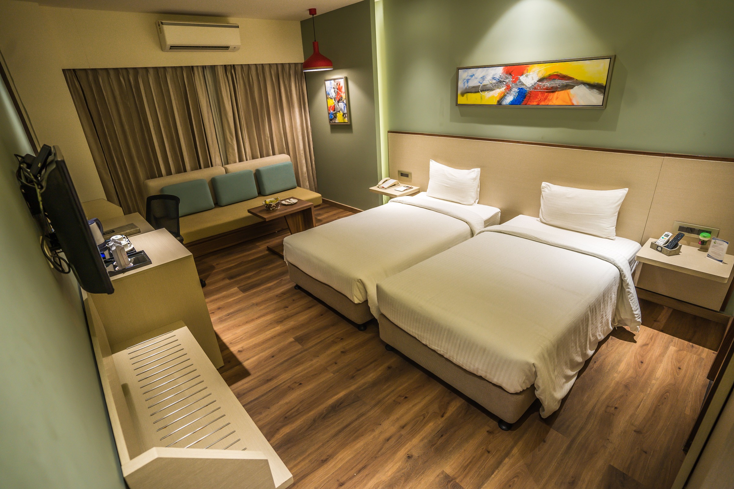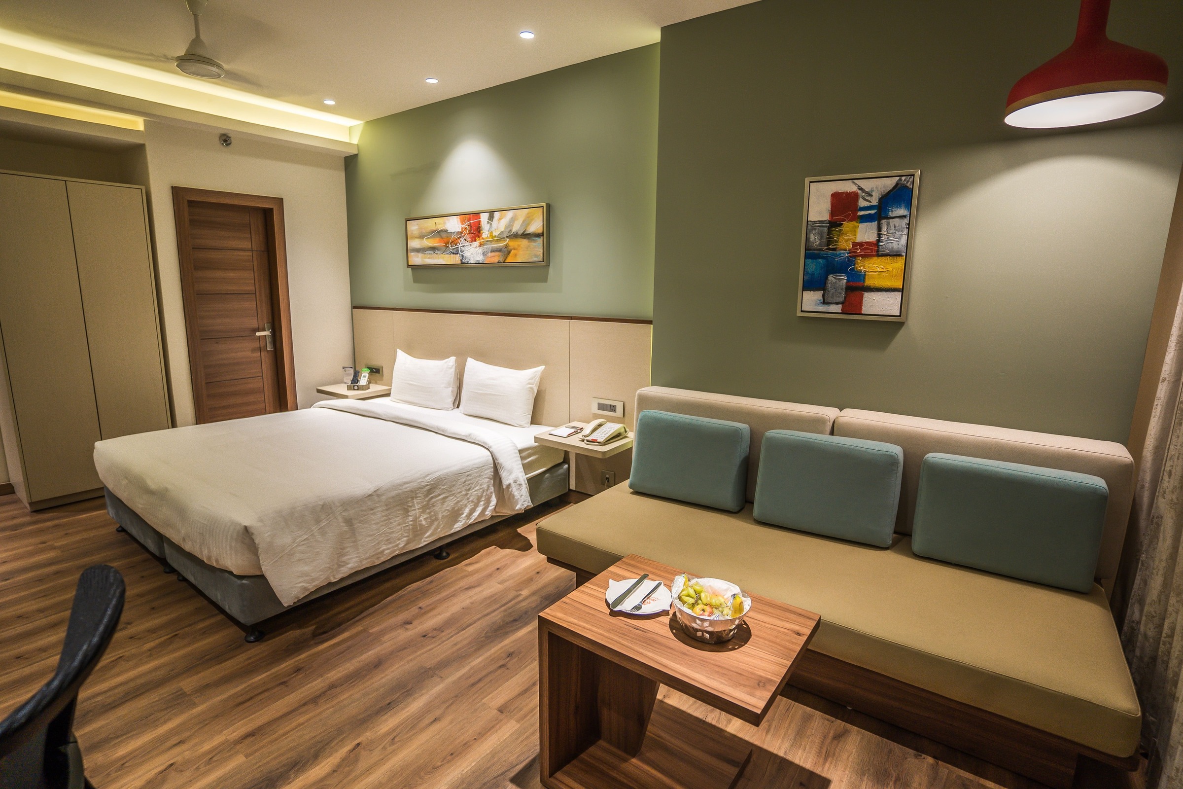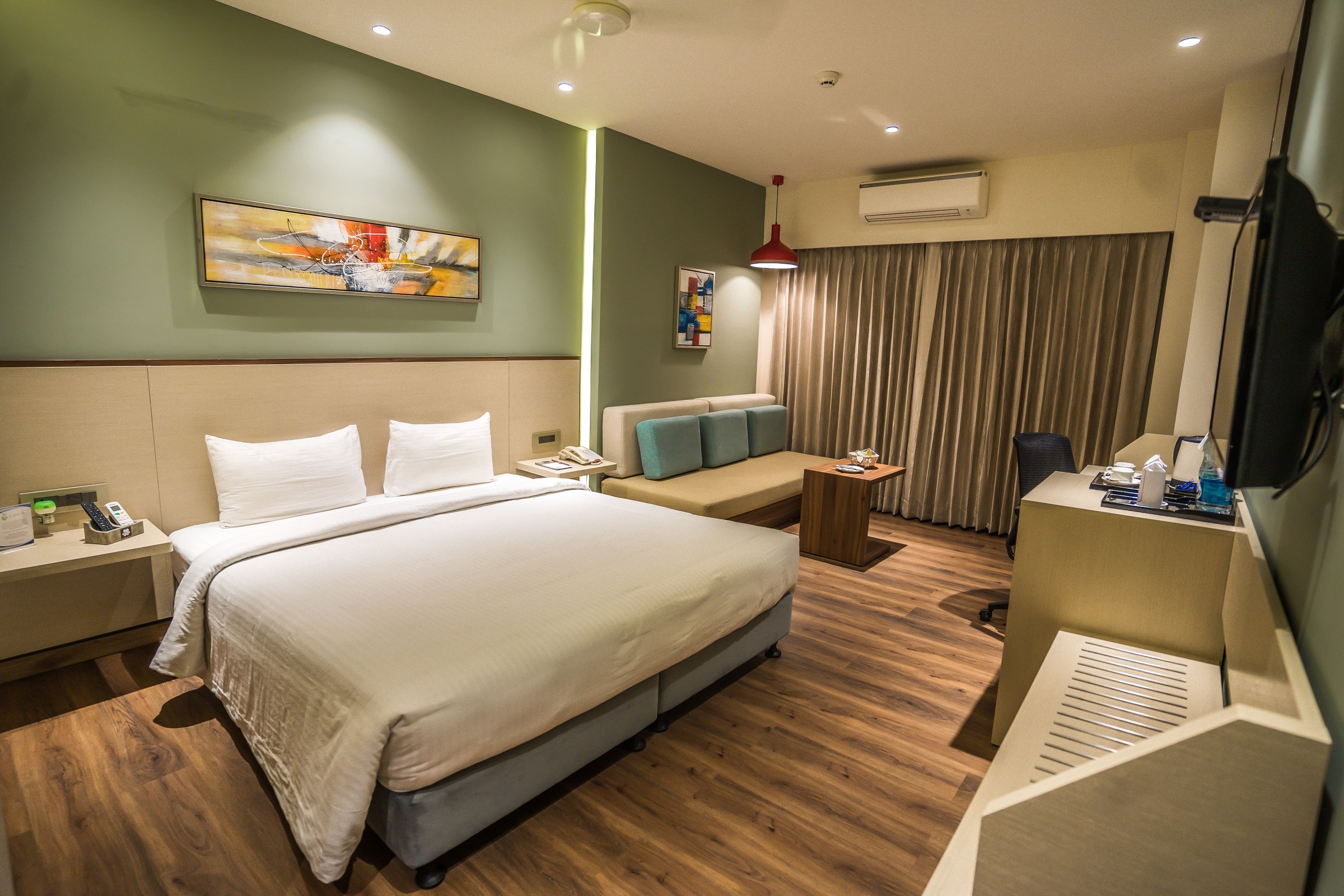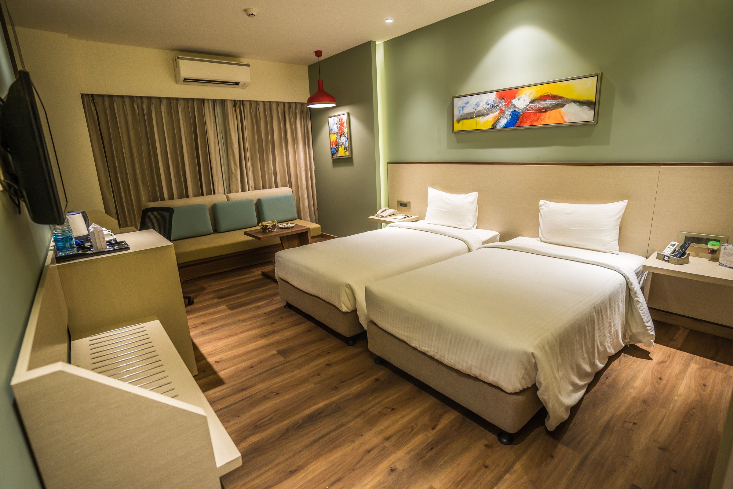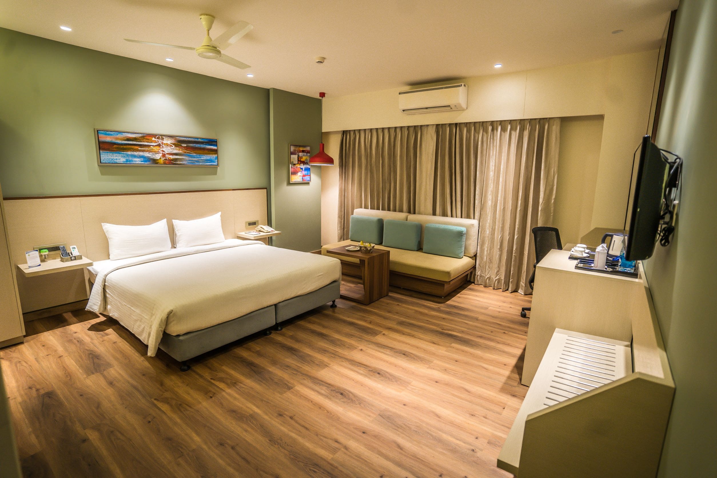 The state of the art and modern deluxe room comes with super- King sized bed or a Twin Bed for Business Travellers, LED TV with 100+ satellite channels, Mini Fridge, soundproofing and air conditioning systems. The bathroom has a Power shower, mist-free mirrors & with all ultramodern fittings. The tariff covers complimentary breakfast and Wi-Fi internet services.